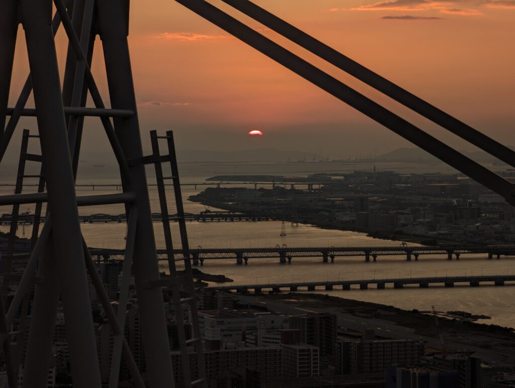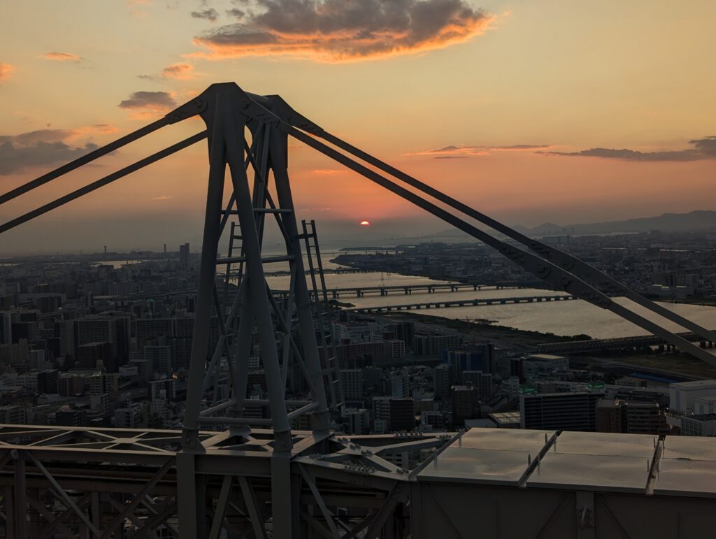 Perfektes Timing: Ich konnte eine Runde drehen, ein paar Fotos machen und mir dann einen Platz für den Sonnenuntergang sichern – der allerdings viel schneller vor sich ging als gedacht. Die Konstruktion des Gebäudes als Silhouette im Bild zu haben, hatte aber irgendwie auch etwas Künstlerisches.